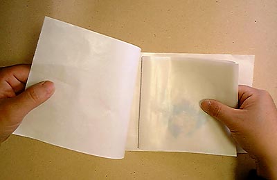 3:押し花アイロンフィルムで挟んだ作品を二つ折り離けい紙に挟みます。 |